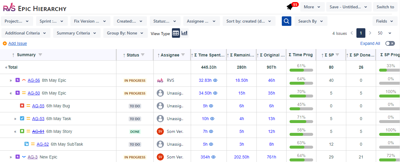 View of Issue Hierarchy in a tree. View the full Jira Issue Type hierarchy of Linked issues, Portfolio/Advanced Roadmaps, Epics, and Subtasks up to 10 levels. Sum up Time Spent, Org Estimate, Time Rmng, % Complete