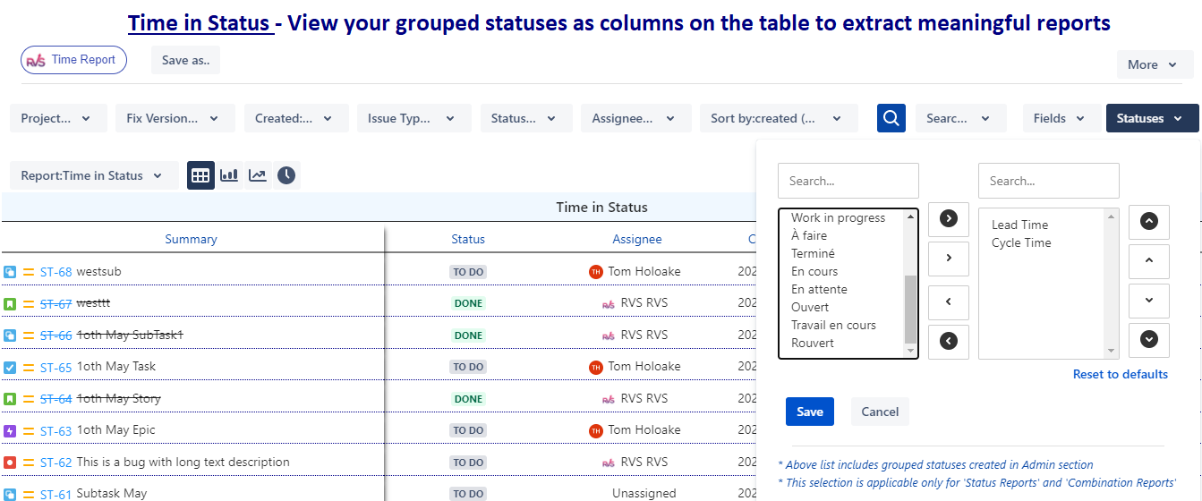 - From the statuses dropdown, select the status “Cycle Time”.