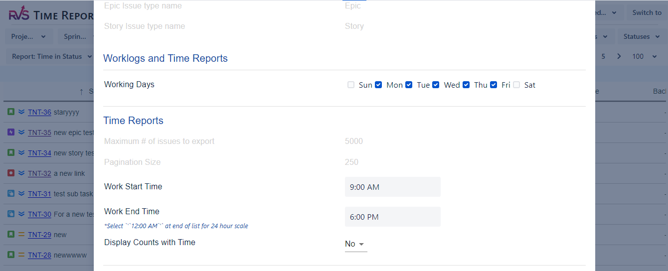 - Set the working days and time in the Time Reports section.
