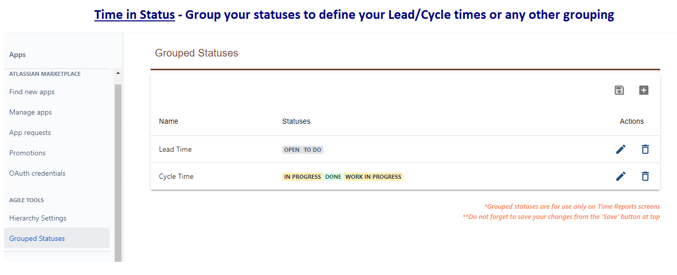 - Select the statuses that belong to each group, e.g., “Cycle Time” might include statuses like “Development”, “Testing”, “Review”, and “Deployment”.