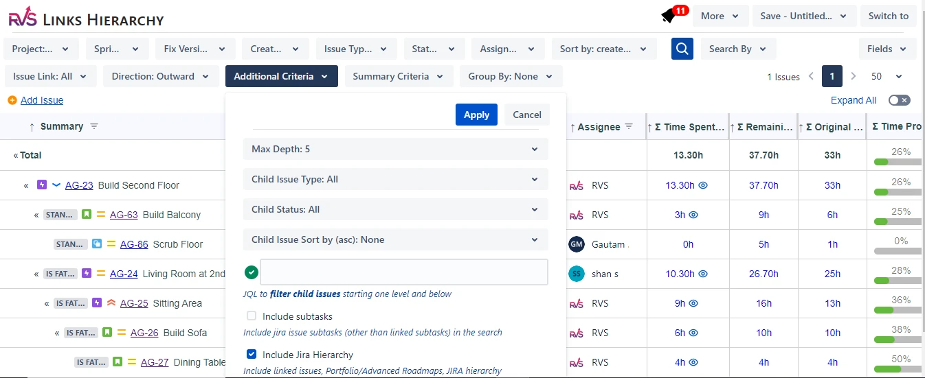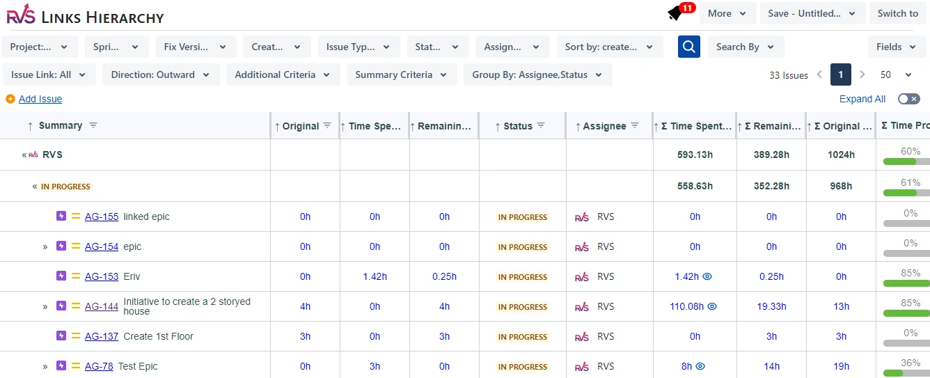 Create / View the full Issue Type hierarchy of Linked issues, Portfolio/Advanced Roadmaps, Epics, and Subtasks up to 10 levels. Sum up Time Spent, Org Estimate, Time Rmng, % Complete Quick Summary bars