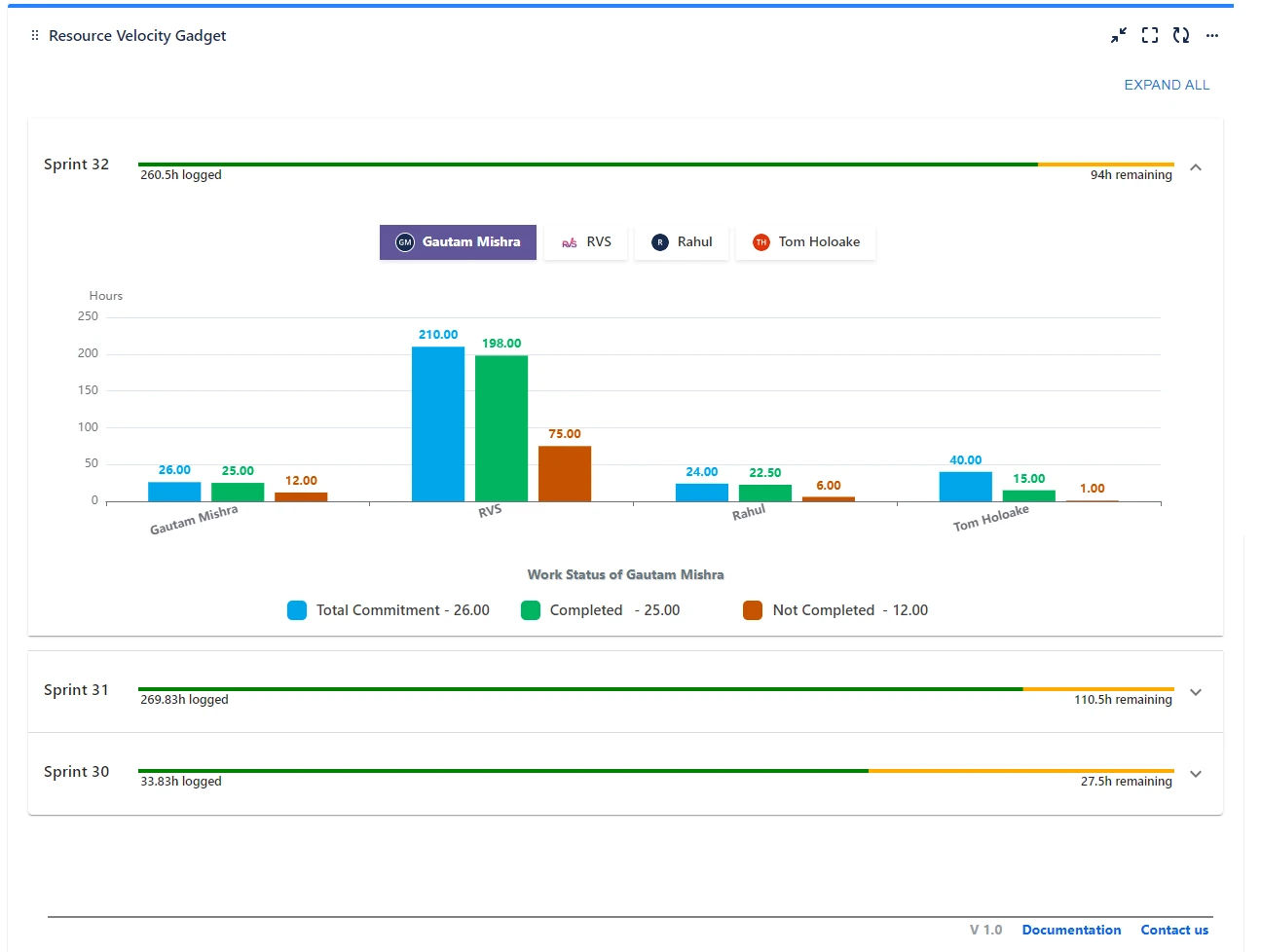 Track the velocity of your resources for multiple sprints through easy to use bar/line graphs