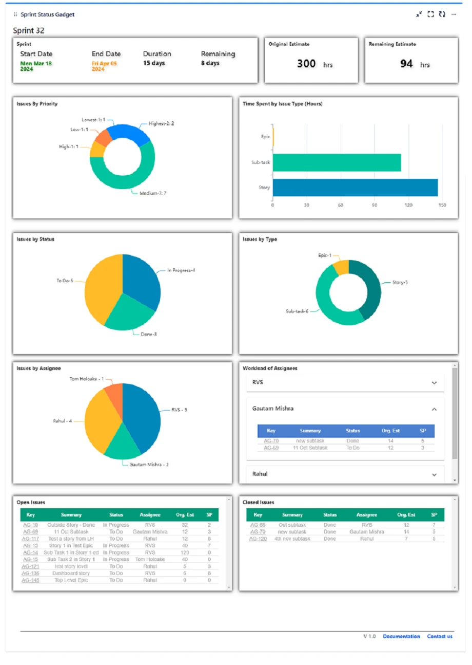 Get a high level overview of your sprint with a predefined status template gadget which includes multiple valuable charts.